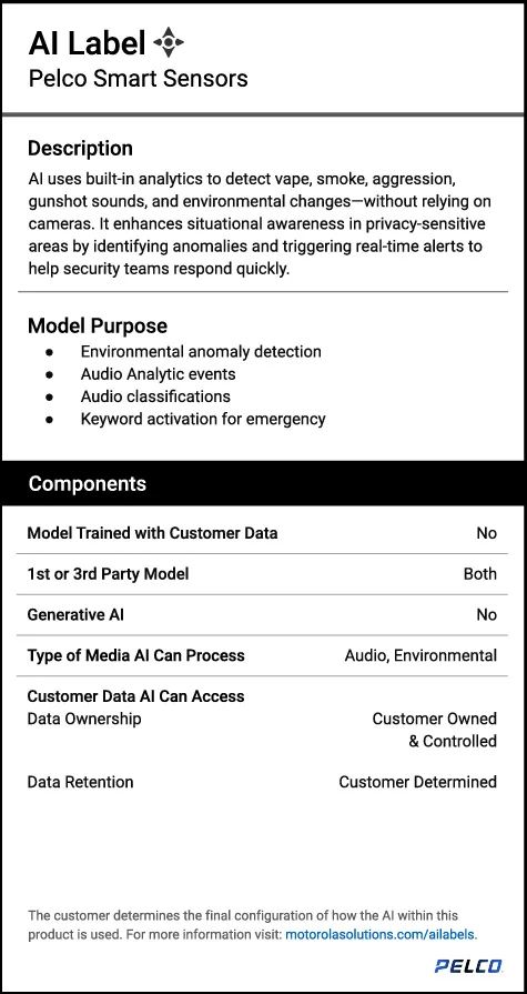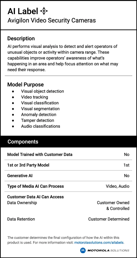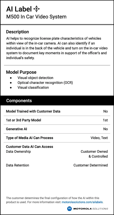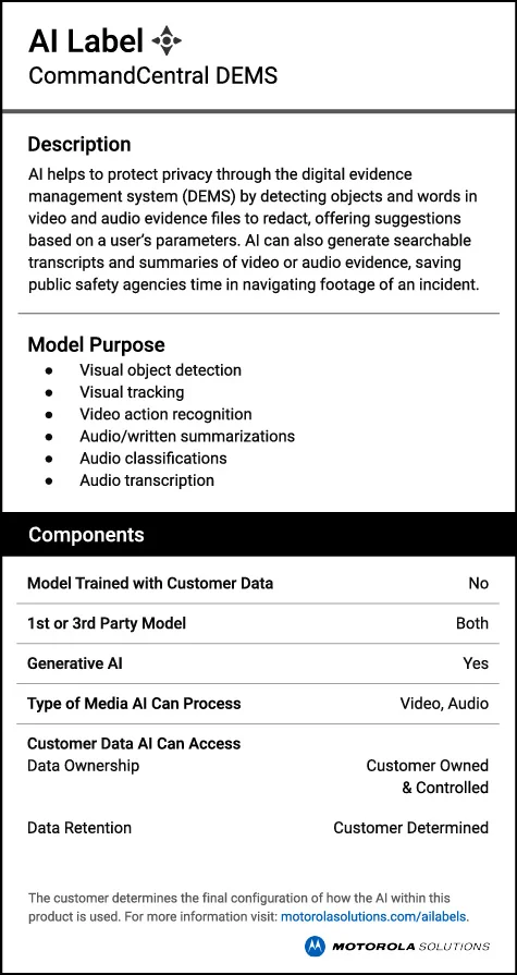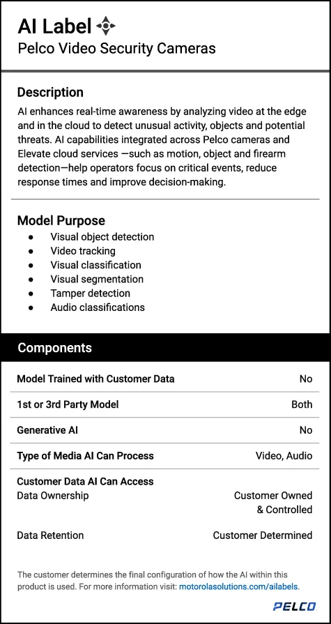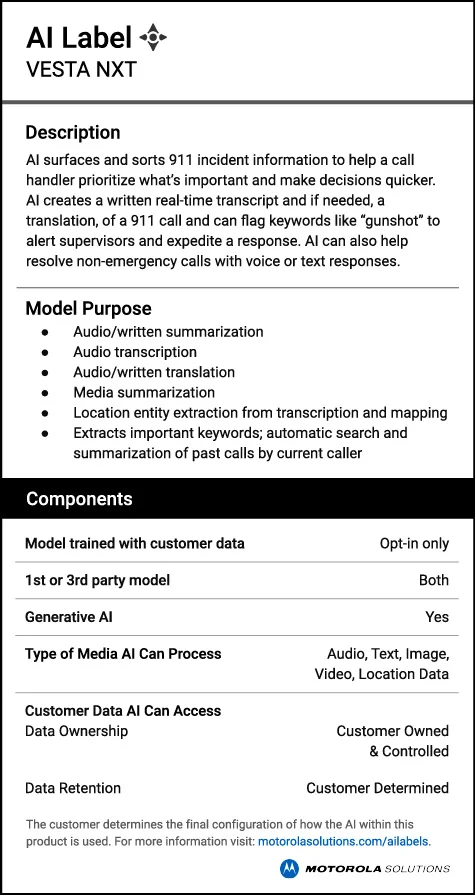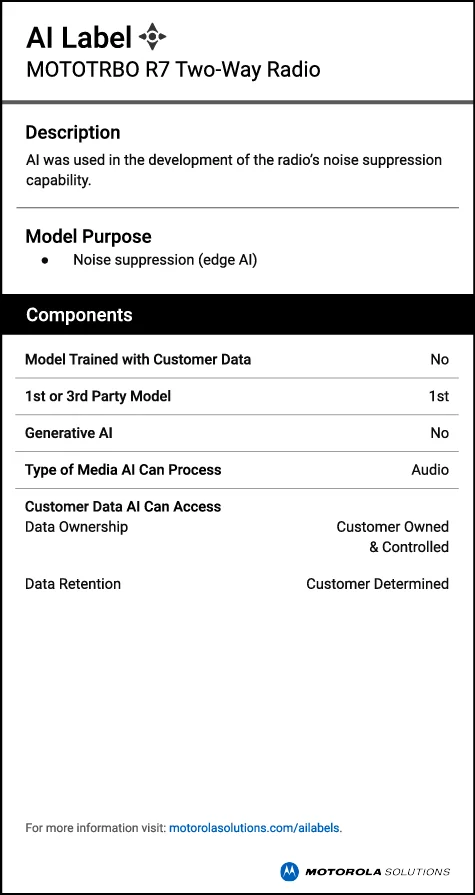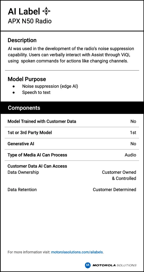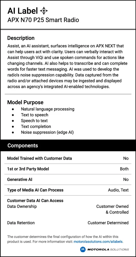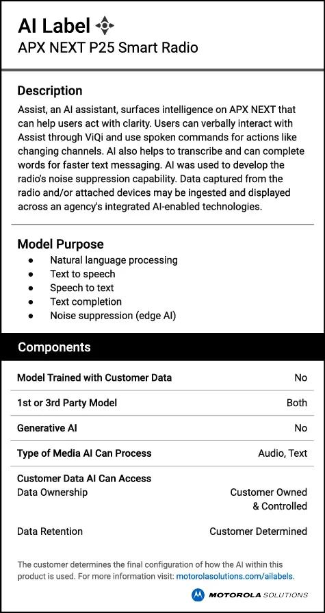Motorola Solutions AI-enabled technologies help to augment human focus, effort and performance when seconds matter. AI labels provide clear, concise descriptions of how AI is used in their products.
